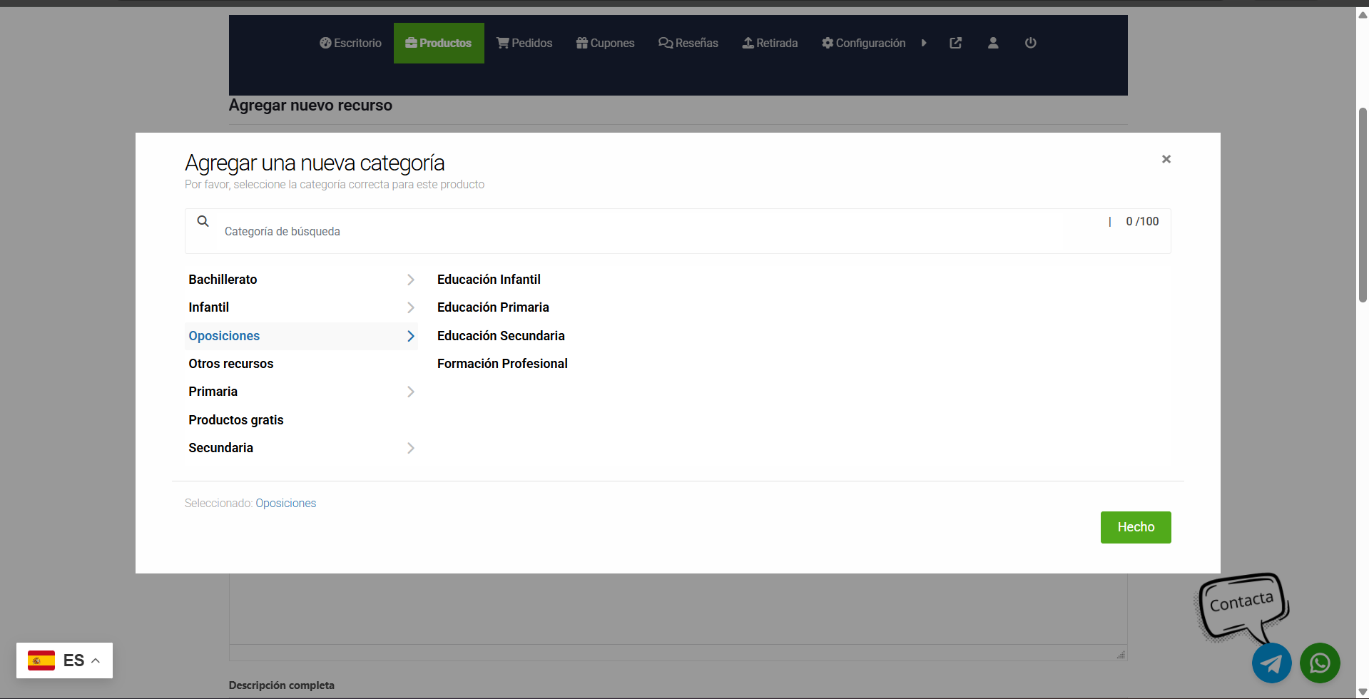5. Categoría: 🔴 ¡Muy importante! No te olvides de desplegar la lista y elegir la categoría correcta (Matemáticas, Lengua, Inglés…) para que los profes puedan encontrar tu material al buscarlo.