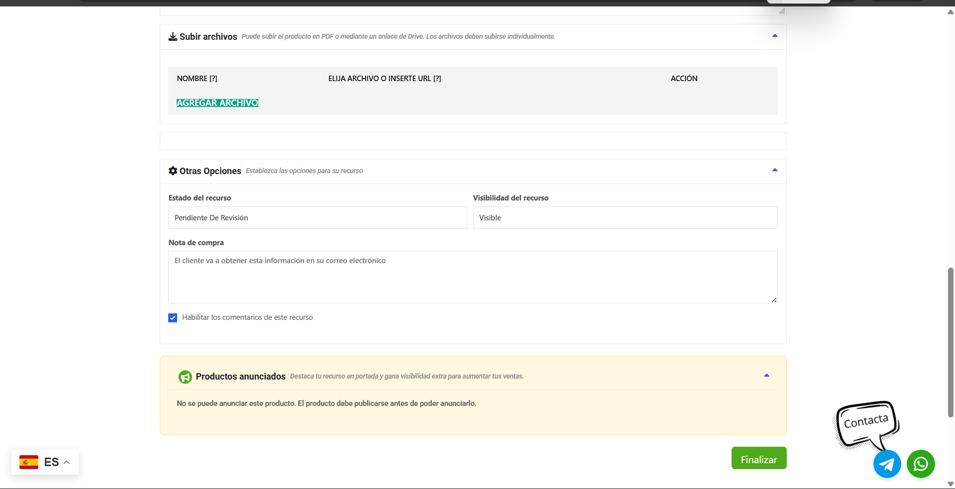 Cuando hayas rellenado todo (título, precio, categoría y archivos subidos), es hora de guardar. Revisa que todo esté bien y pulsa el botón verde grande del final que dice “Crear producto”.