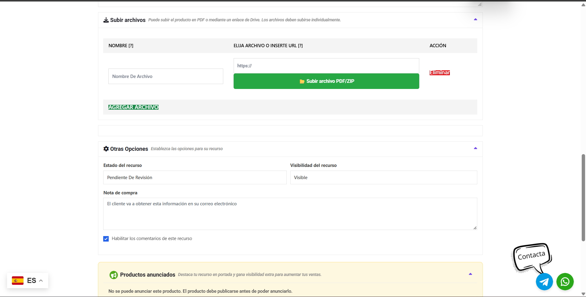 Llegamos al momento clave: subir el material que has creado. En el apartado de “Archivos descargables”, lo primero que debes hacer es hacer clic en el botón que dice “Agregar archivo”.