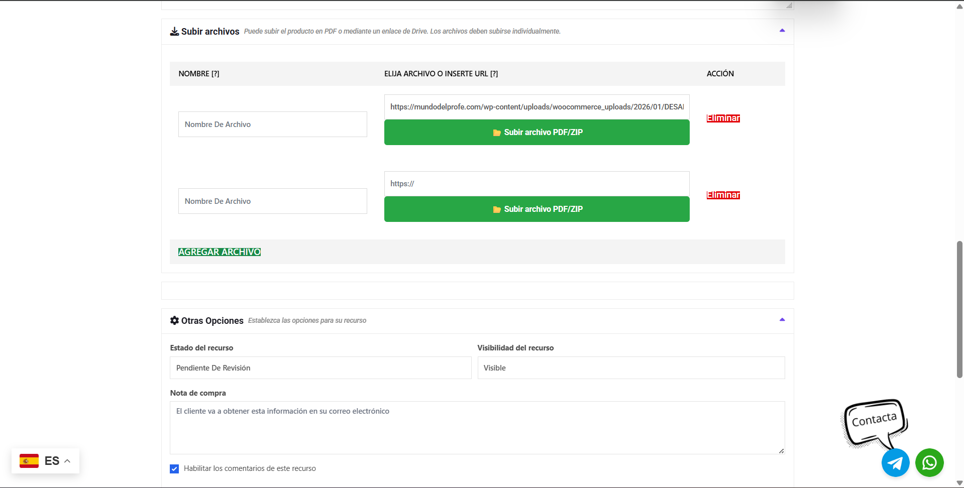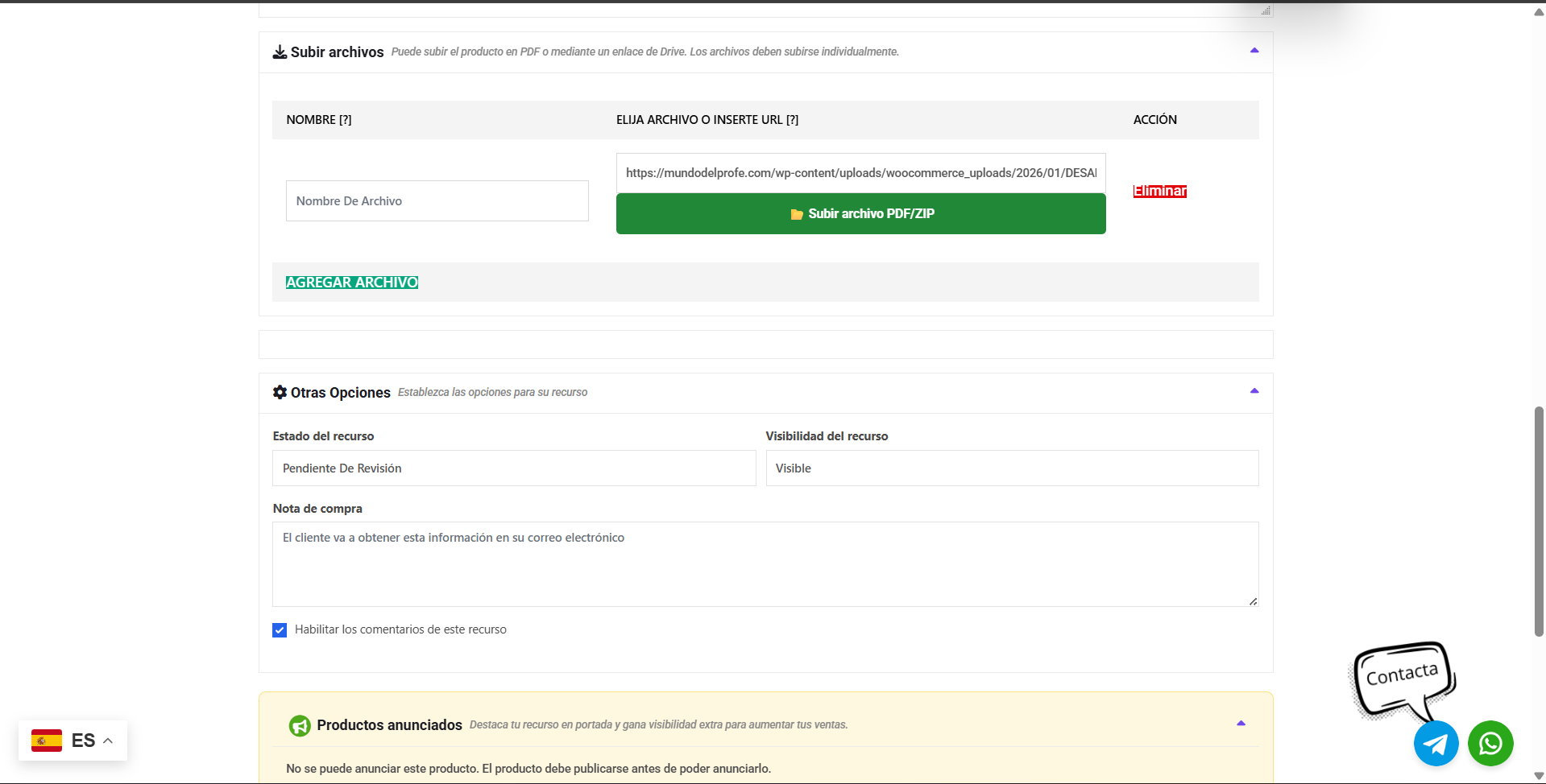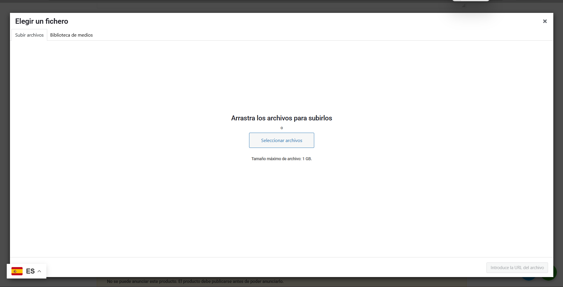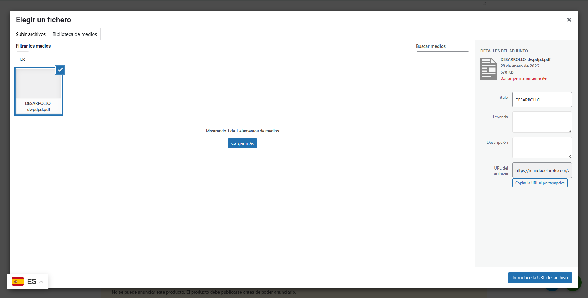 Una vez tengas el archivo seleccionado, busca el botón azul (normalmente abajo a la derecha) que dice “Introduce la URL del archivo”. Al pulsarlo, el sistema guardará ese documento como el producto que se descargará el cliente.