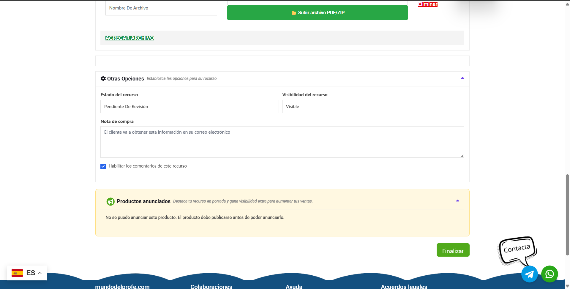 ¿Tu recurso consta de varias partes (por ejemplo, el cuaderno de ejercicios y otro PDF con las soluciones)? ¡No hay problema! Si quieres subir más documentos al mismo producto, solo tienes que volver a pulsar en “Agregar archivo” y repetir los pasos anteriores.