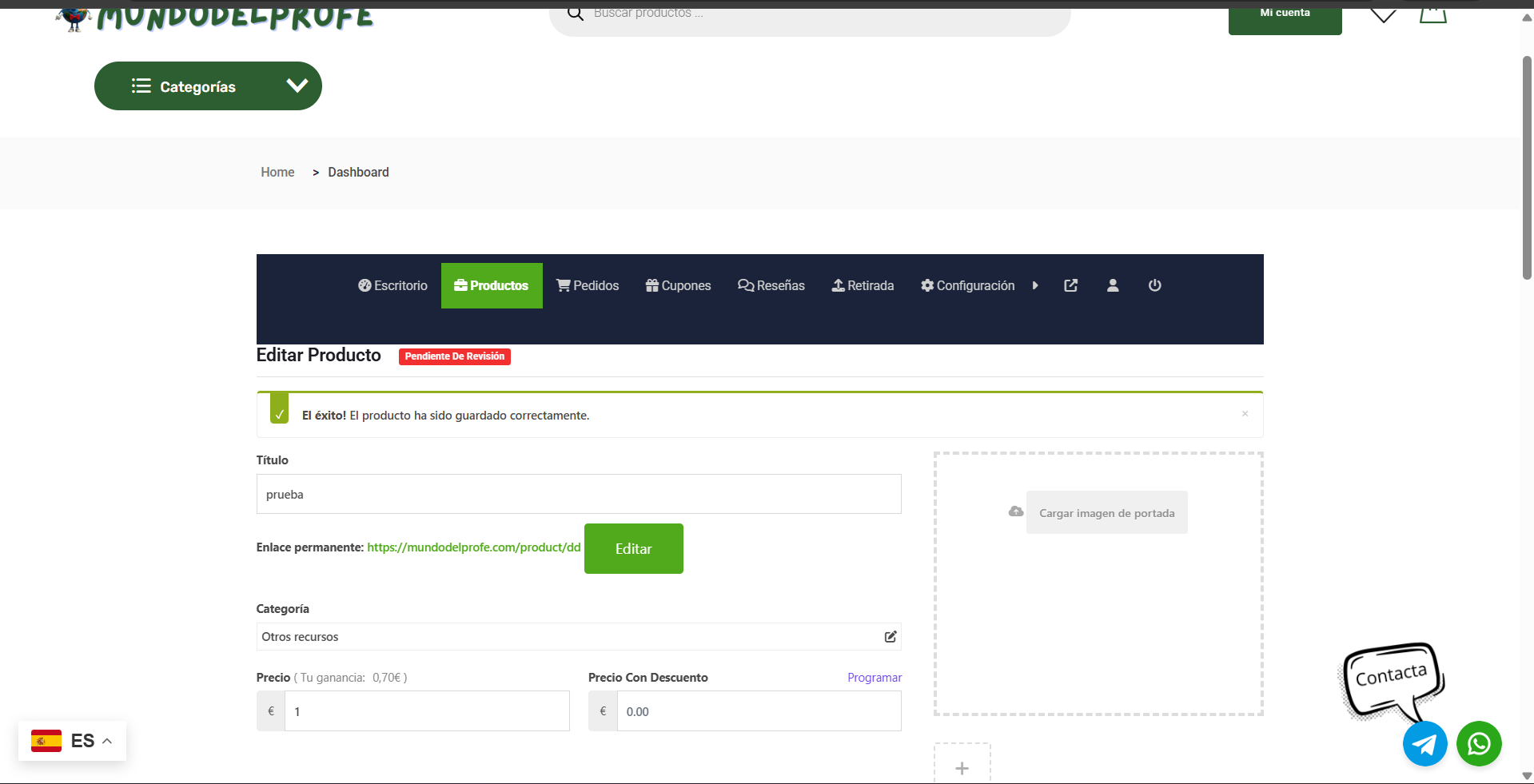 ¡Enhorabuena, ya está subido! Verás un mensaje de éxito. Ten en cuenta que ahora tu producto pasará a estar “Pendiente de revisión”. El equipo comprobará que todo está correcto en un plazo de 24 a 48 horas antes de que salga a la venta.