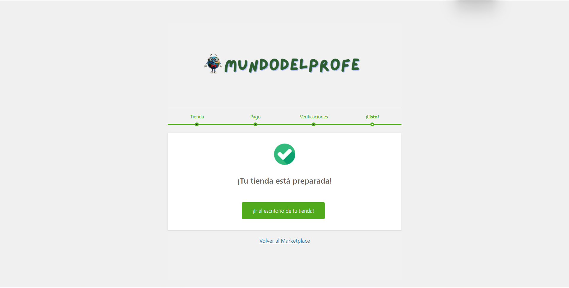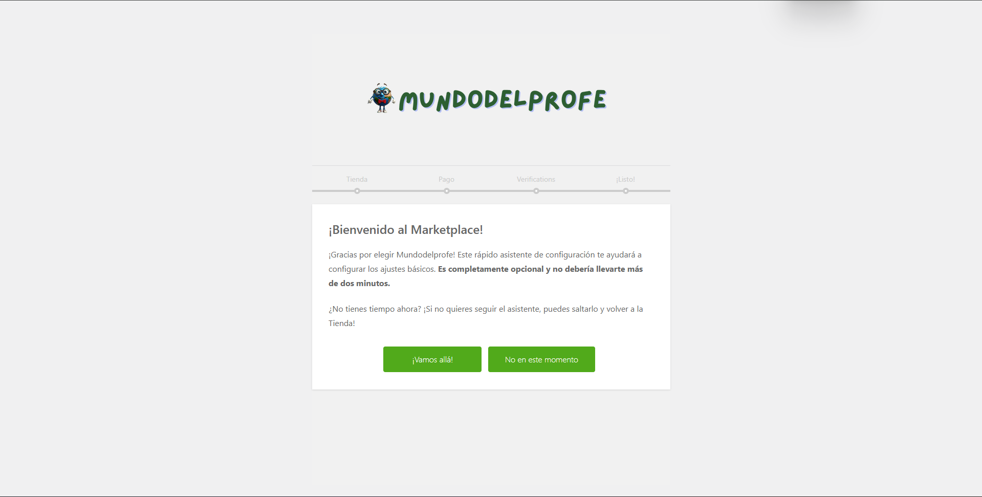 Una vez registrado, te aparecerá una pantalla de bienvenida (“¡Bienvenido al Marketplace!”). Este asistente te ayudará a configurar lo básico rápidamente. Haz clic en el botón verde “¡Vamos allá!”.