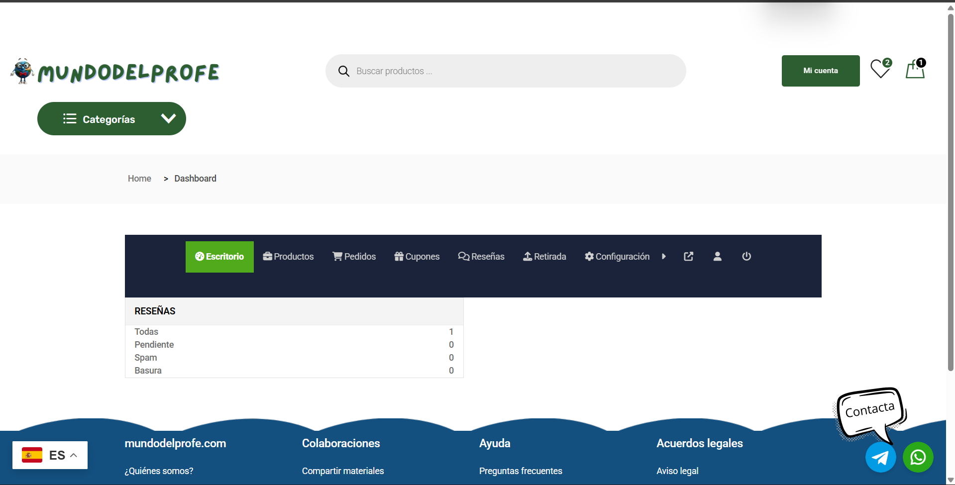 Ya estás dentro de tu Escritorio de Vendedor. Aquí verás un resumen de tus ventas. Para subir material, busca en el menú de la barra negra superior (o en el lateral) la opción que dice “Productos”.