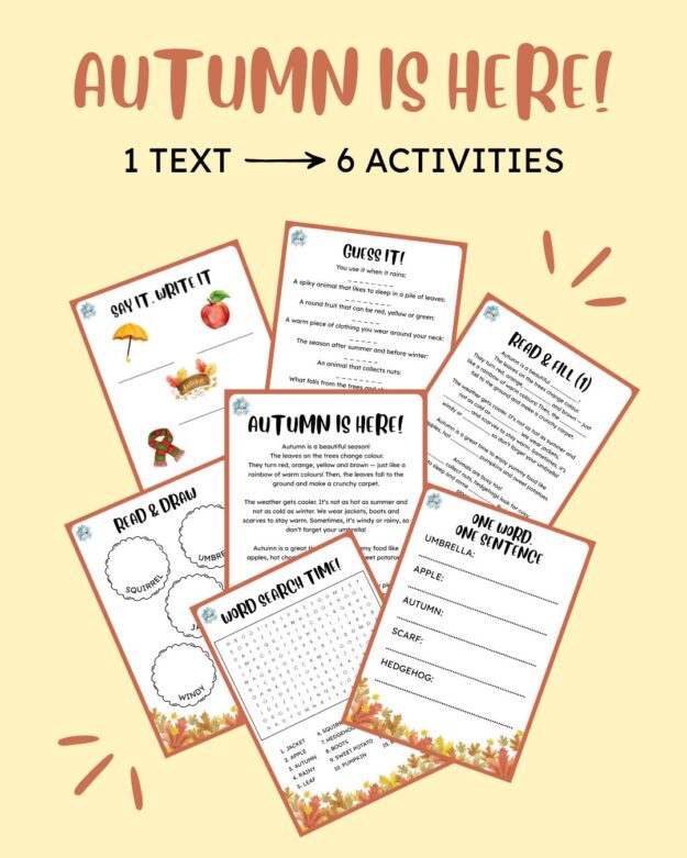 Este material en inglés incluye un texto breve sobre el otoño, una lámina ilustrativa con 15 palabras clave y 6 actividades diseñadas para reforzar el vocabulario, la comprensión lectora y la expresión escrita de forma divertida y significativa.