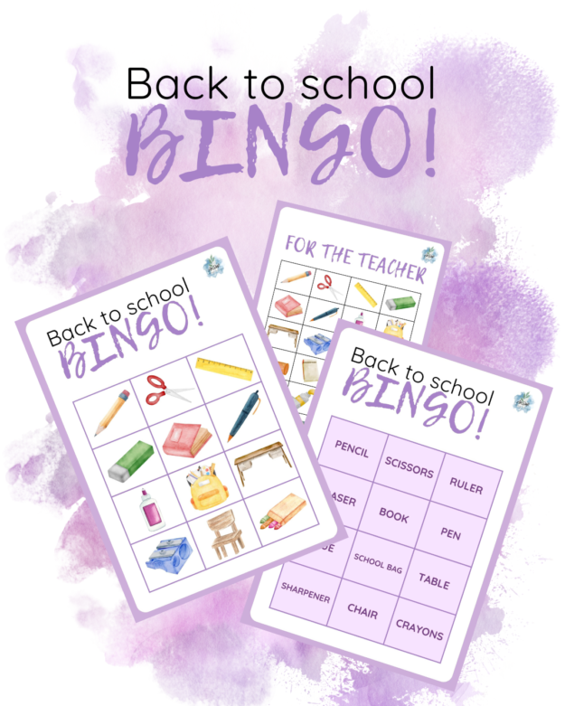 Este documento incluye 10 tarjetas (5 con imágenes y 5 con palabras) para jugar al bingo en inglés y trabajar el vocabulario relacionado con la escuela.