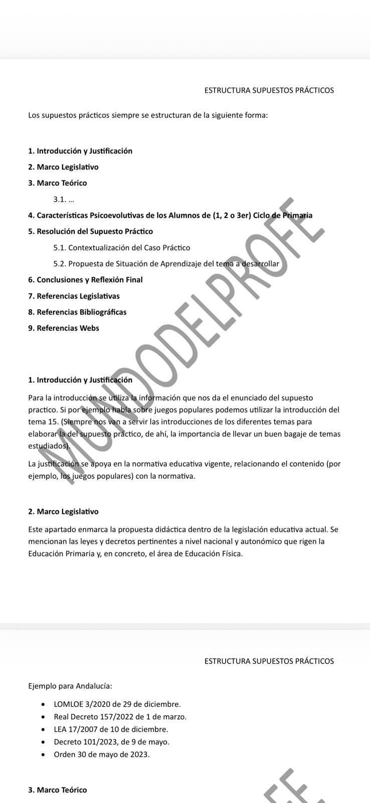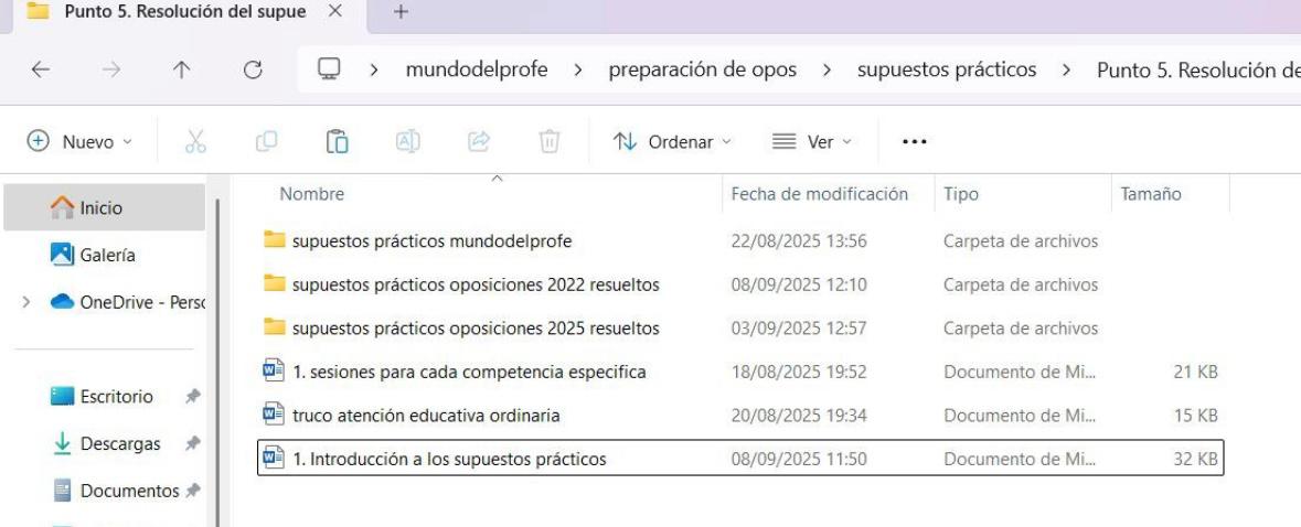 Muchos de los archivos se descargaron un poco desordenados al principio, pero una vez los organicé todo quedó perfecto y muy claro. Los temas están muy bien resumidos y van al grano, lo que se agradece muchísimo a la hora de estudiar. La programación está ajustada a lo que me comentó, incluyendo todos los apartados que se evalúan en la rubrica de opos. Además, trae una gran variedad de modelos de supuestos prácticos que trabajan todas las competencias específicas.