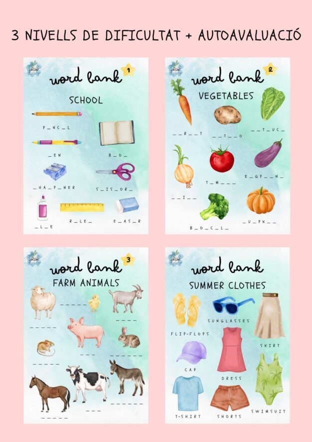En este documento encontrarás bancos de palabras en inglés relacionados con 4 temáticas diferentes: – SCHOOL – VEGETABLES – FARM ANIMALS – SUMMER CLOTHES